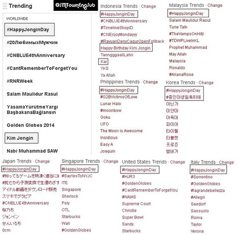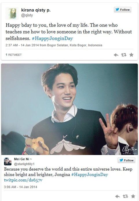 오늘 한국의 팝 센세이션 김종인(카이)은 20세가 되었고, 트위터는 전세계 팬들이 자신들의 생일축하 메시지를 #happyjonginday 과 함께 올리면서 국제적인 축제의 장으로 변했다.