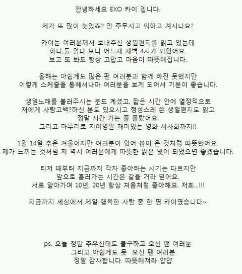 캡쳐 출처: # 카이 생일 조공 & 메세지 # http://pann.nate.com/talk/320642149