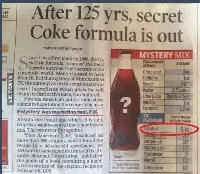 대충 해석해줄게....1886년에 처음 만들어졌고 코카콜라 공식은 세계적으로 비밀 유지되는 것중의 하나인데... 그 비밀을 알고 있는 2명의 직원은 한번도 같이 비행기를 탄적이 없대...1979년 2월 8일 직접쓴 오리지널 레시피래 저 그림이...근데 거기에 알코올도 들어가 있다는거....유 갓 잇? 아그리고 같이 비행기 안타는 이유는 동시에 타서 혹시라도 추락하거나 죽어버리면 안되기 때문이래