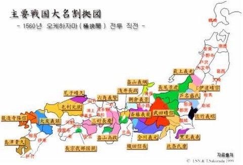 혼례전 일본 전국시대 지도 하늘색 땅이 오이치의 고향인 오와리(지금의 아이치현)이며 그 옆의 노란색 땅이 나가마사의 땅이 북 오우미이다.