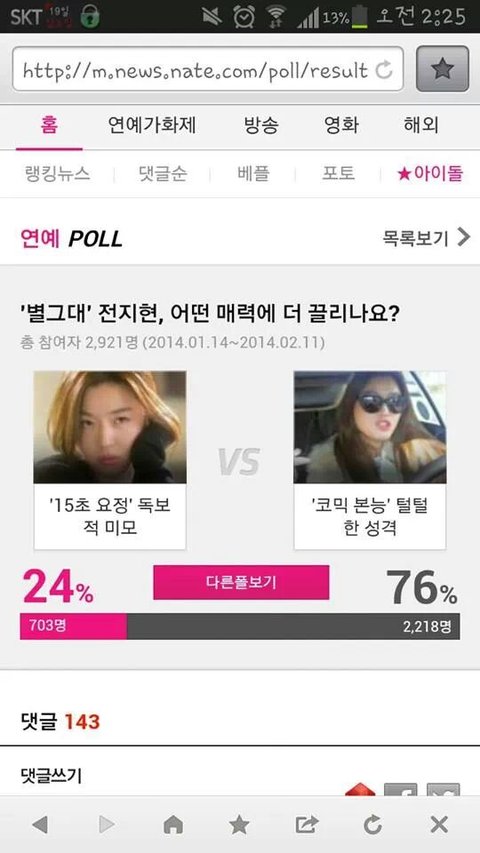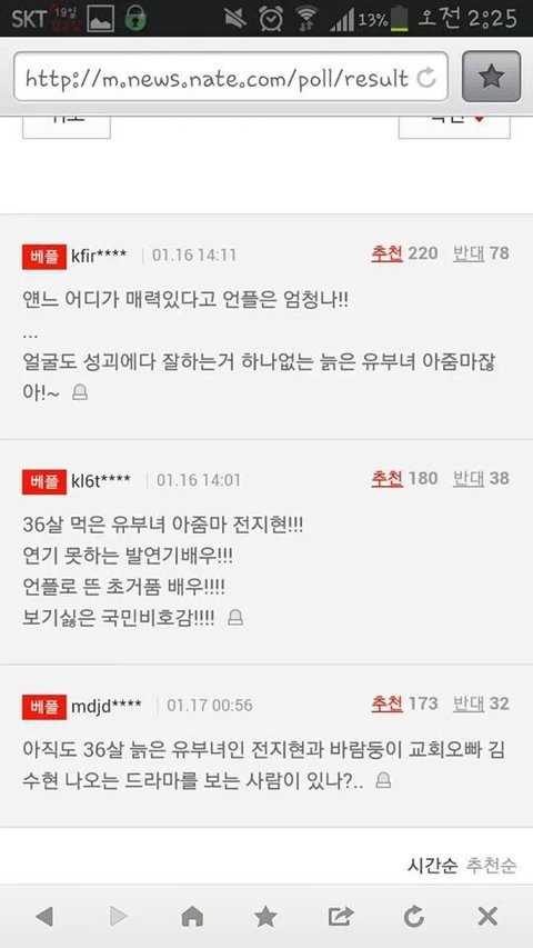 2. 전지현 (천송이) 별그대 관련 투표였고 베플 3개 모두전지현을 심각하게 까는 글들이였음