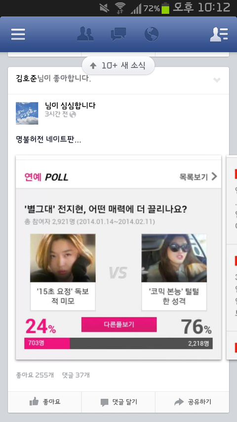 페이스북에서 님이 심심합니다 라는 페이지에서 네이트 판에서 진행되었던 전지현이 출연하는 별그대 관련 투표 페이지와 베플 캡쳐본을 우연히 페이스북을 보다가 보게 되었는데요 근데 진짜 판 하시는분들이 너무 심각하게 전지현을 까는 댓글을 쓰셨고 그게 댓글 모두 베플이였습니다