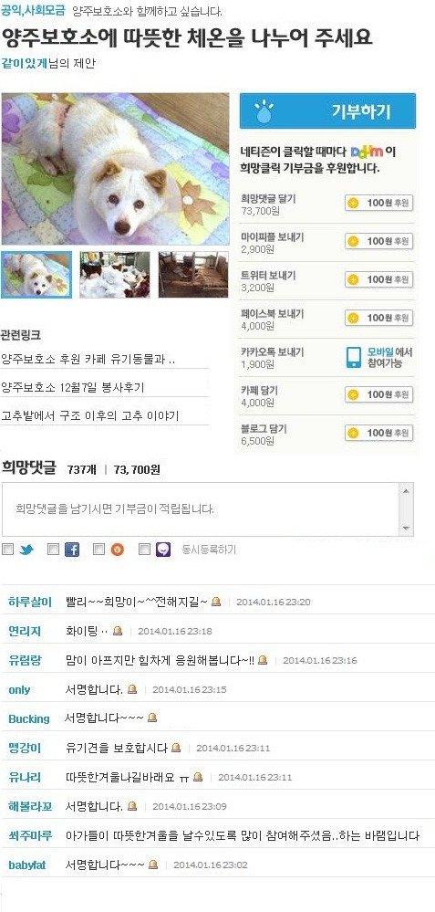 그 외 블로그, 카페, 페이스북에 담기만 해도 100원이 기부된다고 하네요.현재 서명은 2천개가 조금 넘은 상태이며 앞으로 약 3천개의 서명이 더 필요합니다.