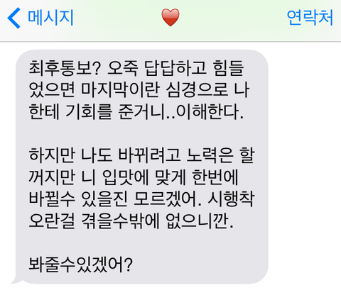 제가 말하는 내내 부정하지 않고 가만히 잘 듣고 있더니, 제 말이 다 옳고 미안하다고 합니다.