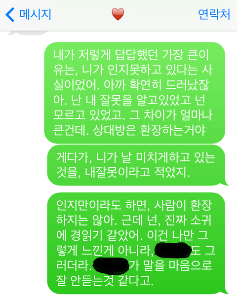 사람이 잘못을 해도 자신이 잘못한걸 인지라도 하고 있으면 대화라도 되는데, 너는 그것조차 모르고 있으니깐 내가 얼마나 답답했겠냐고..