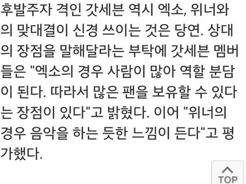 아니 데뷔한지일주일도안된 파릇파릇한신인과 엑소를라이벌삼는다고?말이되이게?!!?!자꾸 라이벌라이벌하는데 엑소가2년이나선배잖아 ㅋ 왜자꾸 위너랑갓세븐인가 핫식스인가들이랑비교하고 라이벌인양떵떵거리냐고 .진짜웃겨서참나 ㅋ