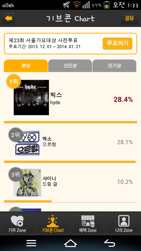 인기상은 투표가 백퍼..근데 3위