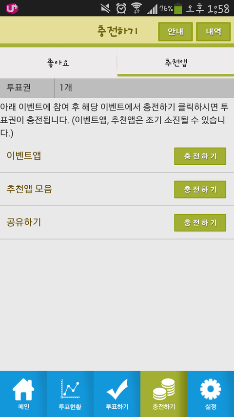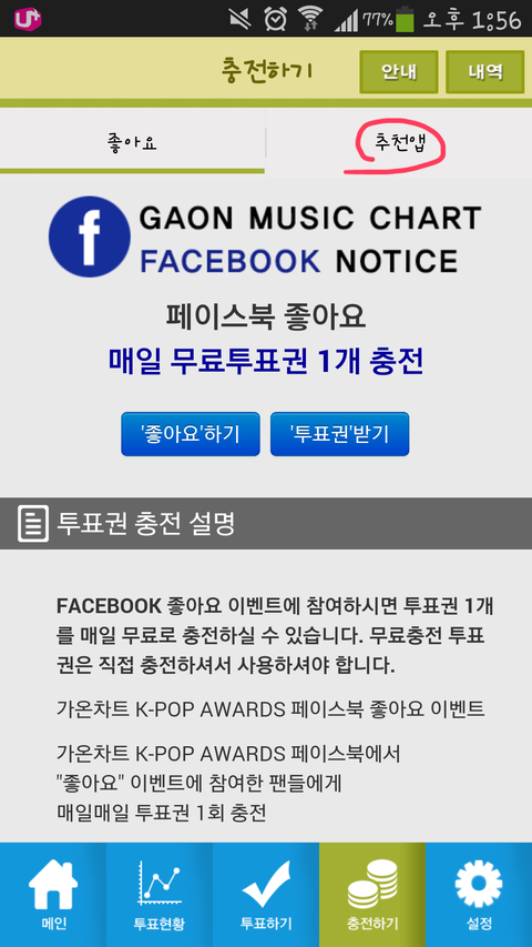 들어가면 페이스북 좋아요를 눌러서 투표권을 받을 수 있어 그리고 추천앱을 누르면