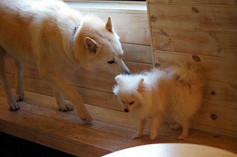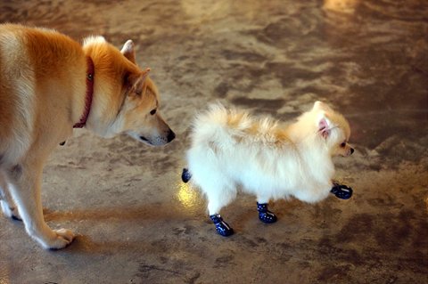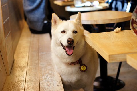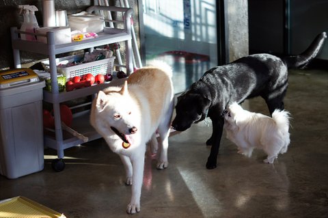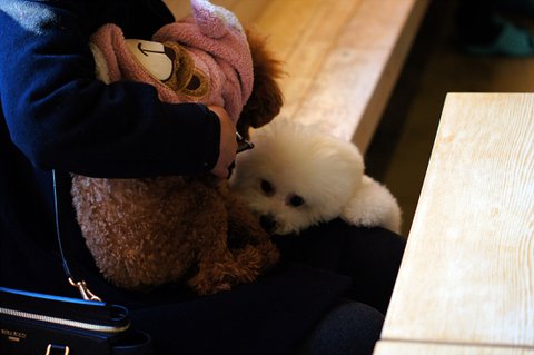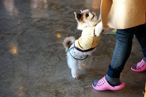 애견 카페 들어와서 작은 친구와 인사하고 있어요
