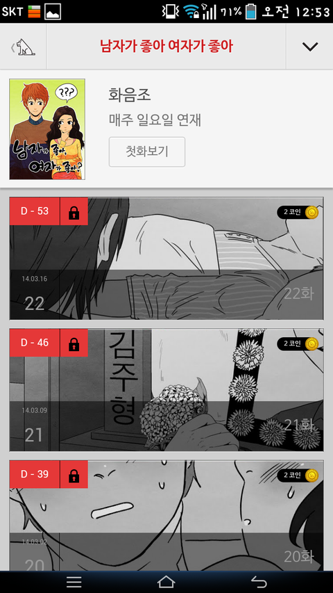 레진코믹스에서 매주 일요일에 연재되는 '남자가 좋아 여자가 좋아' 입니다~ 레진코믹스는 일주일마다 한회씩 무료로 공개되며 돈을 내고 미리 볼수있는방식이예요ㅎㅎ 근데 거의1부끝나면 앞에부분이 유료되서 되도록이면 빨리찾아보세요!ㅠㅠ
