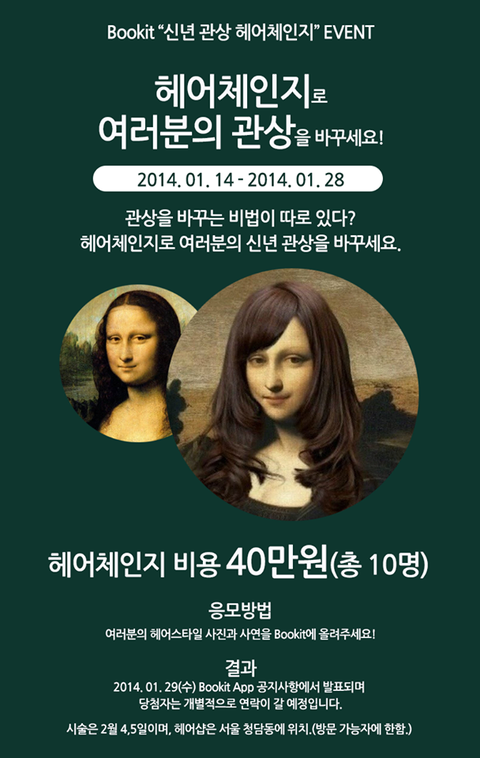 이벤트 참여방법은 Bookit(부킷) 앱을 다운 받고 자신의 헤어스타일과 사연을 간단하게 올리면 바로 자동 응모되고 기간은 1월 14일부터 28일까지이며 당첨자는 1월 29일에 앱 공지사항에서 발표되며 개별적으로 연락이 갈 예정이다.