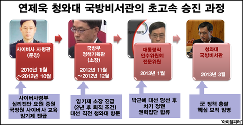 연제욱 현 청와대 국방비서관은 군에서는 보기 드문 승진 케이스입니다. 그는 육사 38기로 NSC 근무 경력자 대부분이 진급하는 데 비해 별을 달지 못한 케이스입니다.