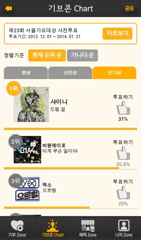 투표방법: 마켓에 '서가대'검색 -기프콘앱다운(가장위에나오는) - 게임이나 gs shop을 깔거나 등등 마일리지를 주는 어플들이 바로 나옴 최대한 많이해서 마일리지 많이받음 - 중복투표가능하니 인기상에 몰표!! 본상은 투표율20퍼라 이미 거의확정.