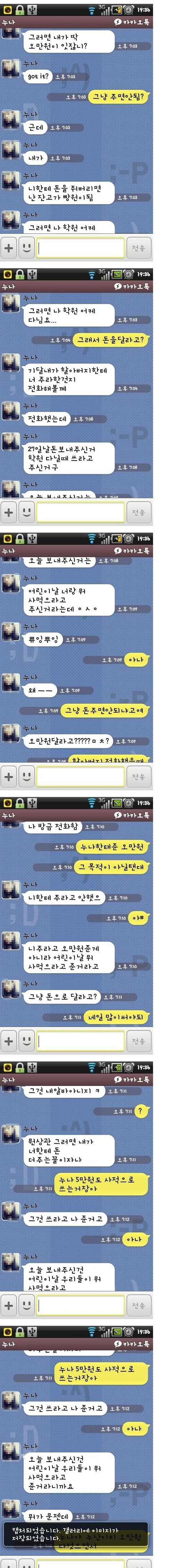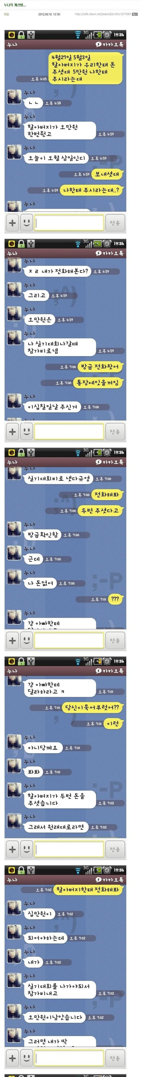 응?? 똑바로 따지믄 5만원은 누나 학원비인가 머시긴가 하라고 준 거고 나머지 5만원으로 둘이 어린이 날 용돈으로 맛난 거 사먹으라 했잖음? 그걸 동생이 십만원 다 용돈으로 주신 줄 알고 그에 대한 반인 5만원 내놓으라 한건데 원래는 5만원 학원비니까 그건 냅두고 나머지 용돈으로 주신 5만원에서 반으로 나눠서 2만 오천원씩 들고 가야하는 건데 5만원을 다 달라고 하니까 누나가 다 주면 지 손해 2만 5천원이 있으니까 다 안주는 거고 그런 상황아님?? 누나가 동생 몫의 2만 5천원도 닦아먹을려고 개수작부리는 게 빡치긴하지만 똑바로 따지자면 2만 5천원만 줘야하는 게 맞는거 아님??? ㅡㅡㅡㅡㅡㅡㅡㅡㅡㅡㅡㅡㅡㅡㅡㅡㅡㅡㅡㅡㅡㅡㅡㅡㅡㅡㅡㅡㅡㅡㅡㅡㅡㅡㅡㅡㅡㅡ 응??? 이렇게들 많이 읽을 줄 몰랐고 모바일이라 띄어쓰기 안되는걸로 알고 있어서 띄어쓰기 안하고 대충 댓글 쓴건데....ㅇ ㅡㅇ 이렇게 컴으로 쓰면 띄어쓰기 정돈 할줄아는 여자예요 ㅜ 관심받을 줄 몰랐어.... 그렇다고 "대구년아"라고 욕한 니놈은 내가 신고 ㄱㄱㄱ 띄어쓰기 해놓으신 분 거 있길래 복사해놨어요 ㅋㅋㅋㅋㅋ 귀찮아서 ㅋㅋㅋㅋㅋ 미안들했어요 ~ 까칠하기는 !