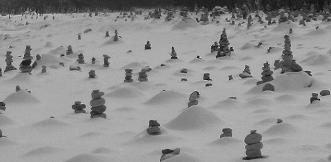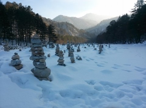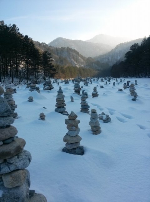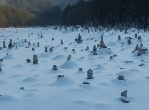 바람이 일고 눈보라가 일때이거나 석양질 무렵이라면 돌탑들의 풍경이 더 운치있겠지만,