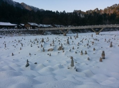 각자 저마다의 크고 작은 소원을 담은 돌탑이 계곡 위로 주욱 펼쳐집니다.