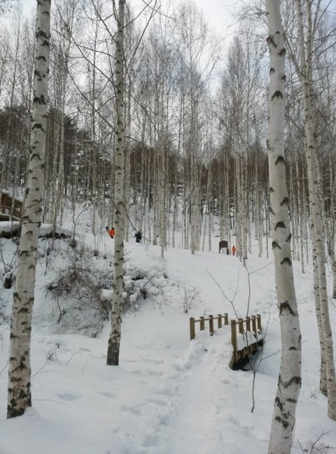 입구에서 자작나무 숲까지는 편도 3km를 걸어야 합니다. 경사가 거의 없는 임도이지만 눈이 쌓인 길이라