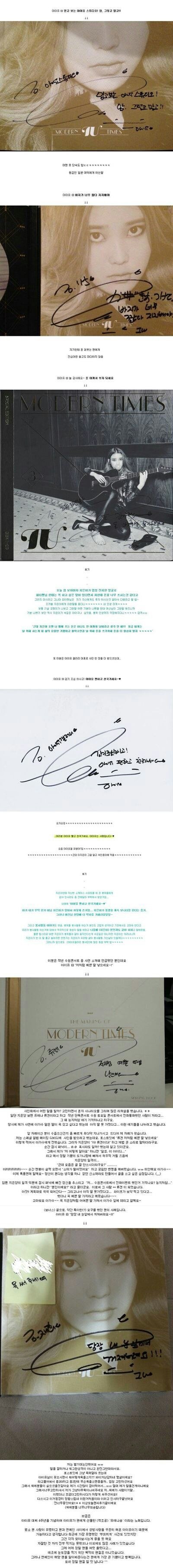 아이유는 글에서 "'눈팅은 여기저기 많이 하지만 혹시 제가 보고 있다고 생각하시면 사이트마다 그 고유의 자유로움이나 솔직함이 사라질까봐 웬만하면 글을 안 남기려 했었는데 방금 집에 와서 선물 뜯어보다가 깜짝 놀라서 글을 남깁니다!"라고 밝혔다.