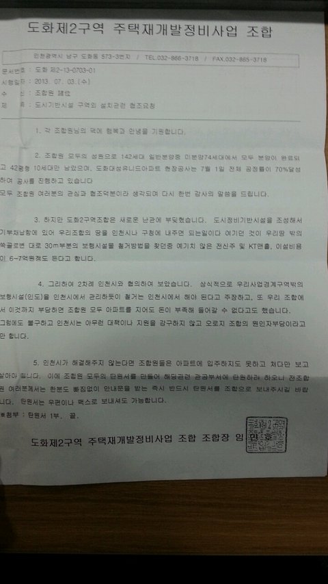 문제는 이제부터 시작이었습니다. (사진 1)인천시가 작년 7월에 전신주 및 KT맨홀 이설비용을 저희 조합원들에게 청구를 하였고 조합원들은 아무것도 모른채 이러한 부담을 짊어지게 되면 입주를 할 수가 없다고 말을 하였으나 인천시에서는 조합원들의 책임이라고만 합니다.55명의 조합원들은 마른 하늘에 날벼락을 맞은 것처럼 6~7억이라는 돈을 부담하게 생겼습니다.