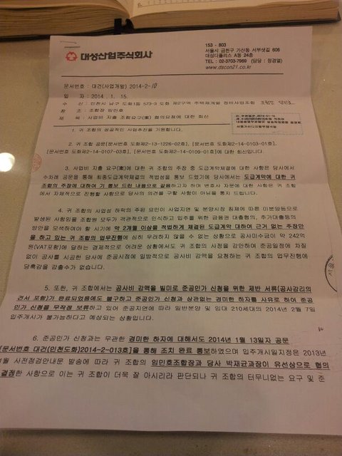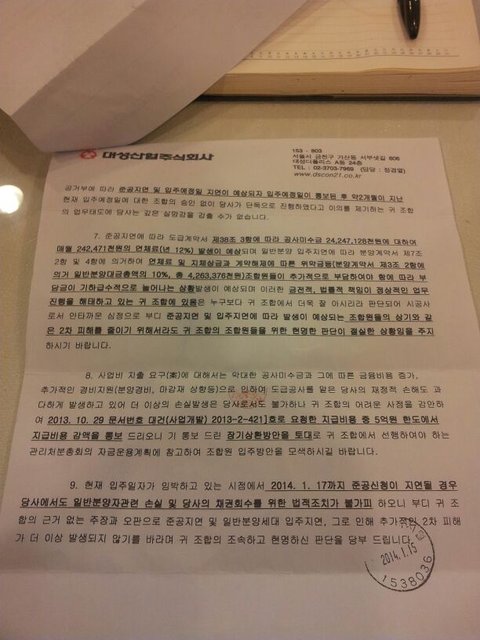 조합원들은 이러한 사실에 혼란스러워하며 자칫하면 집을 잃는건 당연하고 빚까지 떠앉게 될거라는 현실에 하루하루 뜬 눈으로 밤을 지새우며 괴로워하고 있습니다.그러던 와중에 2014년 1월 18일에 '대성산업'으로부터 아래 사진과 같은 내용증명이 발송이 되었습니다.