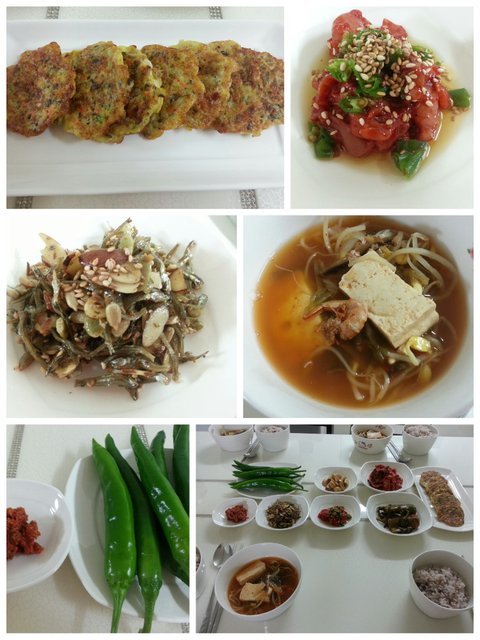 느타리버섯전, 창란젓갈, 모듬건과류멸치볶음,콩나물김치국(멸치다시육수내어서,,),오이맛고추로 상차림.