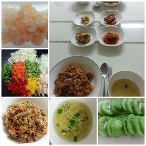 새우야채볶음밥(들기름에 볶음)과 맑은콩나물국(다시마+저민마늘+실파 투하).