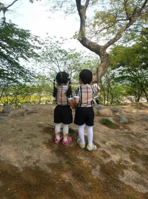 손을 꼭 붙잡고 언덕을 올라 무언가를 물끄러미 바라보는 이 꼬마 커플이 궁금해