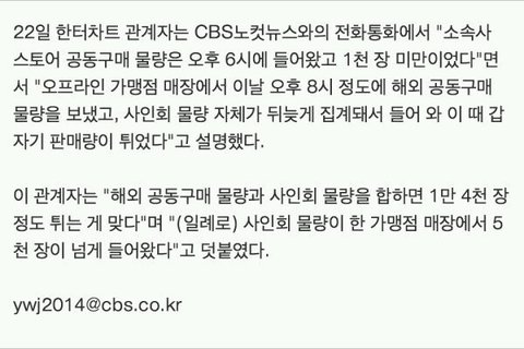 지금 나온 한터해명은 그리 다른 입장은 아니죠. 어디가 어떻게 팔렸다는 루트만 좀 나온것이이죠. 판매량들어온거 맞고, 다 확인했다는 기존 녹취록과 그렇게 다를거없습니다. 다만 이렇게 계속 문제가되는건 정말 해외물량과 사인회물량을 누가 샀냐는것. 저정도의 다량구매면 당연 공구를 진행한측의 인증내역이 올라와야 할 시점이겠죠. 또 이런인증은 다른 팬덤들도 이미하고 있는거구요. 그리고 저기사는 딱 19일날 판매량만 이야기한것 같은데.. 사실 더문제되는 건 금토일 3일간 무려 4만장정로를 판 화력에 있습니다. 범위가 더넓어요. 이것또한 같은 루트,즉 공구와 해외구매로 만들어내었다면 이에대한 인증을 하면되겠죠. 하지만 조금 어려워보이는게 지금 대형아이돌로 분류되는 음판강자들도 힘든 일이니까요.