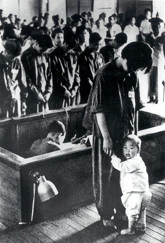 서너살된 어린아이가 갑자기 방청석에서 죄수들이서있는 곳으로 아장아장 걸어가더니 고개를 떨구고 있는 엄마의 손을 잡았다.