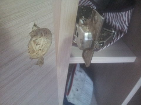 다시 본론으로 돌아와 이번 구입한지 1년 9개월 쯤 된 시점에서 이번엔 화장대의 문짝 나사가 자동으로 풀리더니 문이 떨어졌습니다. 사진으로 보시는 것 처럼 나무의 나사 쪼이는 부분이 삭아서 나사가 다시 쪼이지도 않더라구요. A/S 기사도 와서 다시 쪼아보고는 이건 나무가 상한거니까 우선 더 굵고 긴 나사로 임시방편으로 고정시키고 다시 연락주겠다고 하고 갔습니다.