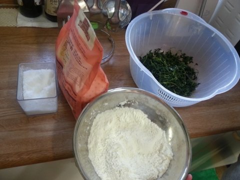 준비물은 쑥, 소금, 설탕, 밀가루입니다.