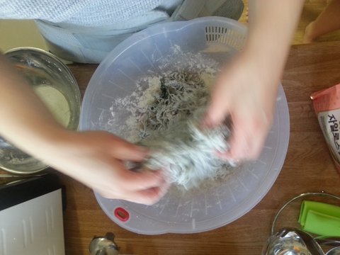 밀가루 많이 묻히고 싶었지만 그렇게 해도 너무 질분질분해진다고 합니다.