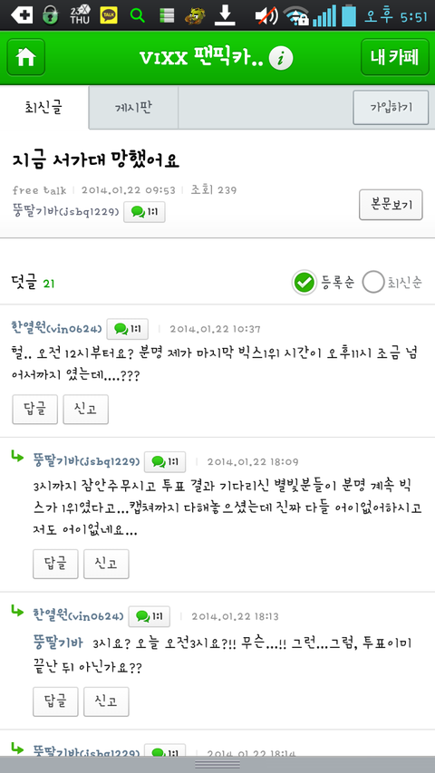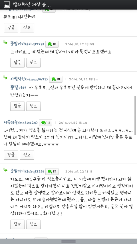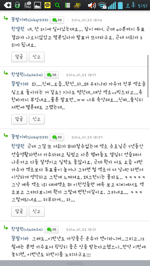 서가대 기사좀 볼라고 서가대 쳣더니 나와서 들어가봤는데 투표해서 우리가 이겼다는데 왜 불만 스엠 돈얘기는 왜나옴 누가보면 우리가 스엠한테 돈받고 투표한줄 알겠네;;;