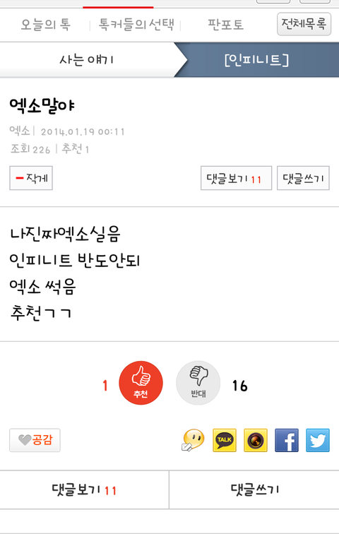 이거보면진짜빡친다진심근데오늘은우리가합쳐서이딴거조카무시하고우리엑소진심으로축하해주자오늘수상소감봣지?그러니까우리가이제엑소지켜주자인슾시발조카나대는데우린그냥개똥쳐다보듯이봐주고조용히반대누르면되는거야