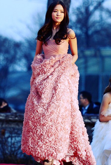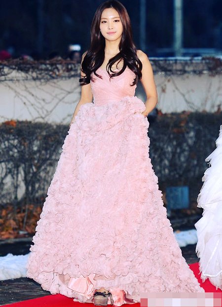 얼굴만큼 화사한 꽃분홍색의 장미꽃 드레스를 입고 시상식에 온 손나은