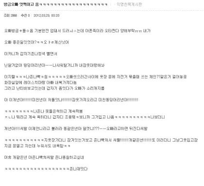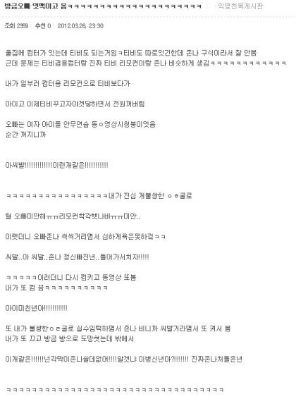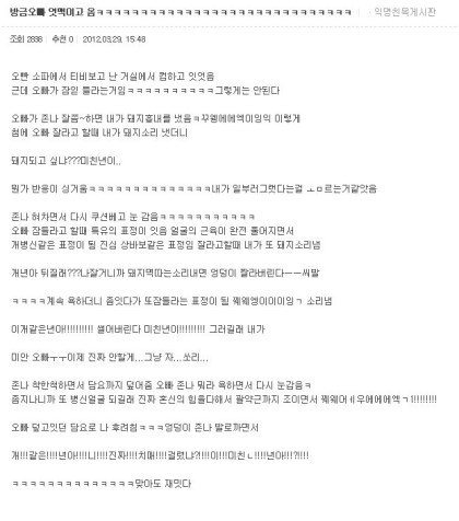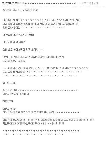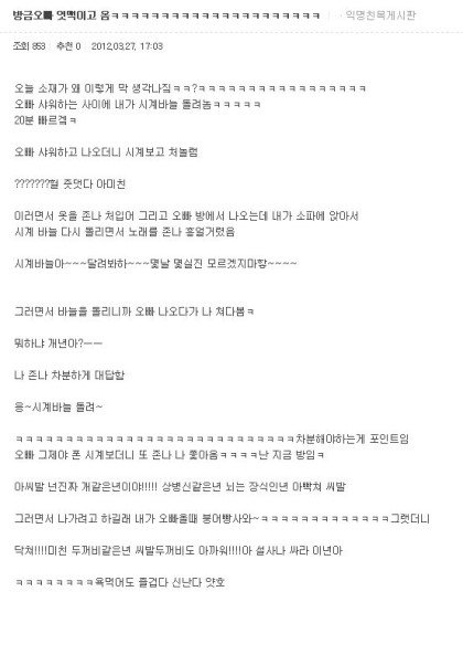 난 차라리 저런게 부러움ㅠㅠ난 오빠랑 대화가 없음..ㅎ문자한것도 보면 다 ㅇㄷ?ㅇㅇ ㄴㄴ 이런거 밖에 없고;;그나마도 마지막으로 문자한지 반년도 더 됨 전엔 서로 욕이라도 했지 둘다 기숙사고 그러다보니까 얼굴 볼 시간도 별로 없고 집 와도 각자 자기방에만 있음 차라리 싸우고 욕할 때가 그립다