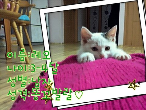 이 추운겨울날 작디작은 아이는포대기한장에 둘러 쌓인체 어느 차옆에 버려져있었지요.그걸 보신 한 아저씨께서 병원으로맡기셨으며.. 지금은 나천사에서 보호중입니다.그깟 포대기 한장이면 아이가 죽지 않고살 수 있을거라 생각했을까요?그냥 버리기 미안하고 불쌍해서 베푼정말 작고 작고 작은... 아량...