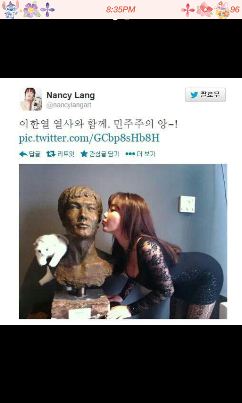 지금저희지역시내에서작품전시회같은거하는데거기에낸시랭작품도잇거든요;근데 김대중.노무현.이명박.박근혜 대통령의 사진을 그려놓고 그 대통령 어깨에 자기 고양이를 얹어 놧더라고요.진짜일베인줄