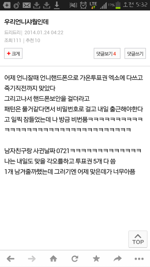 그래서 언니 퇴근시간 맞춰서 자는척하다가 진짜 잠들었는데 일어나자마자 몰래 언니 핸드폰보니까 자기전에 이미 투표 다했나봐
