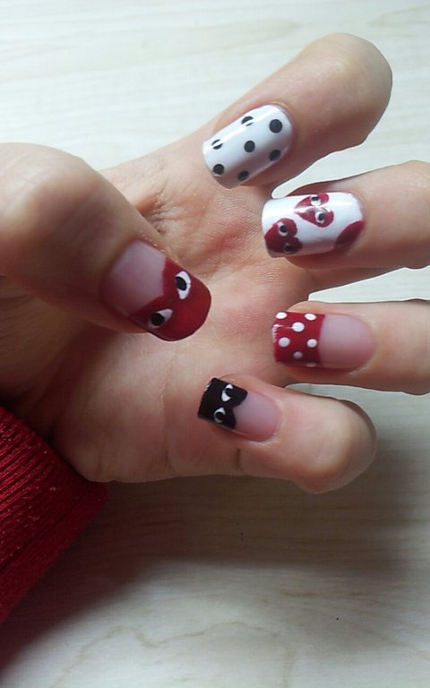 꼼데가르송 네일이예요!다른분이 하신거 보고 따라해봤어요 하트그리고 눈 그리는데 진짜 힘들었어요ㅠ