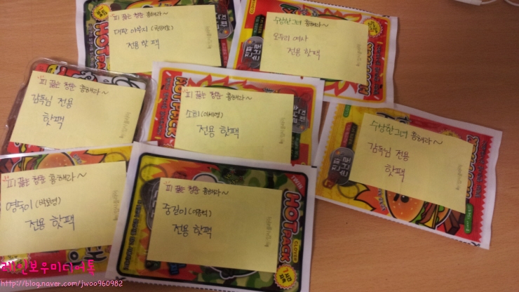 그리고 어젯밤 금요일, 배우분들과 감독님들을 위해서 직접 일일이 손편지를 쓰고 핫팩도 준비했습니다.