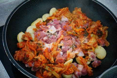 후라이판에 올리브유를 두르고 슬라이스한 마늘을 먼저 노릿노릿하게 구운다음 김치와 고기를 넣고 같이 볶습니다.