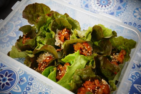 그리고 상추 쌈을 말아서 밥을올리고 쌈장 살짝 올린뒤 고기볶음을 올립니다. 그리고 깨소금으로 마무리 ㅎㅎ