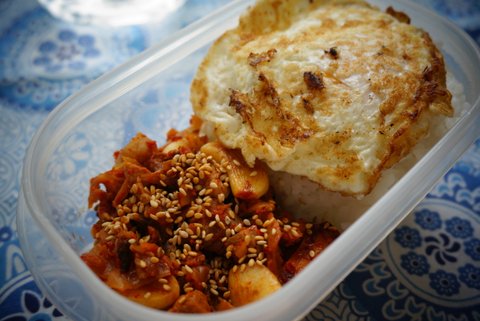 남은 김치돼지볶음과 밥은 또 따로 담아서 계란프라이 하나 올려서 정통 도시락 완성