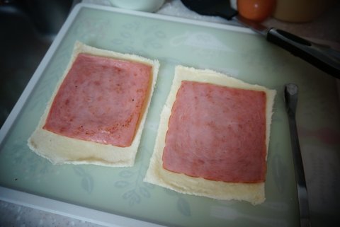식빵은 부드러운 우유식빵을 준비하고 가장자리는 잘라내고 컵 옆면을 이용해서 눌러 펴줍니다. 마요네즈를 약간 뿌려 고루 펴주고 살짝 구운 슬라이스 햄을 얹어줍니다.