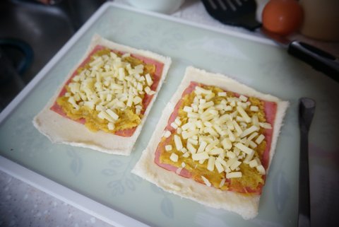 으깬 고구마를 펴서 얹고 피자치즈를 골고루 뿌려줍니다.