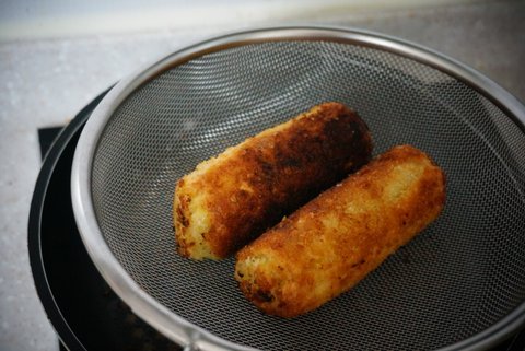 김밥말듯이 말아 랩으로 싸서 잠시 둬서 고정시킨다음 랩을 풀고 밀가루 계란 빵가루 순서로 묻혀 기름에 잘 구워 냅니다.