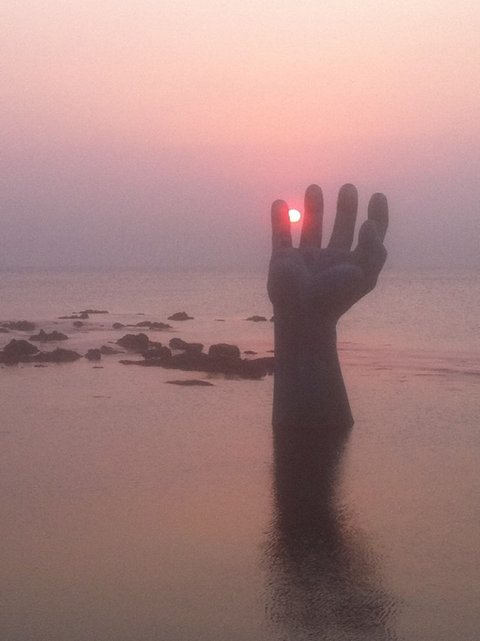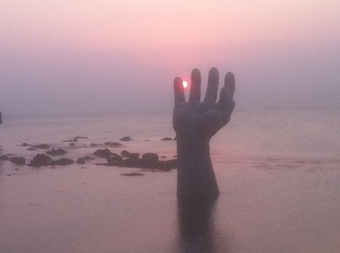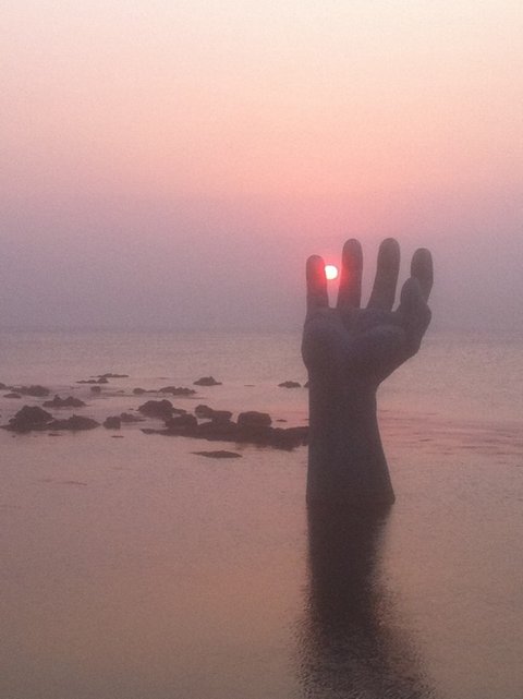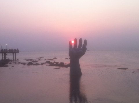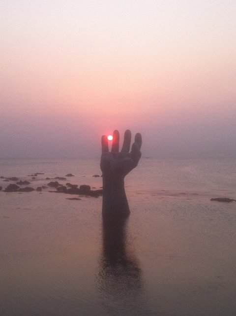 조금 더 기다리고 해는 드디어 이 손 사이에 빼꼼히 자신의 모습을 드러냅니다.