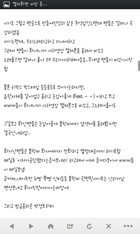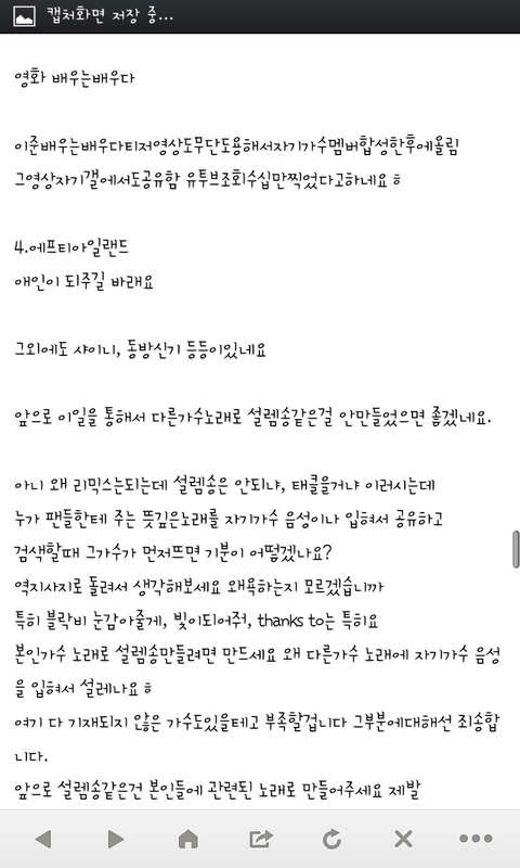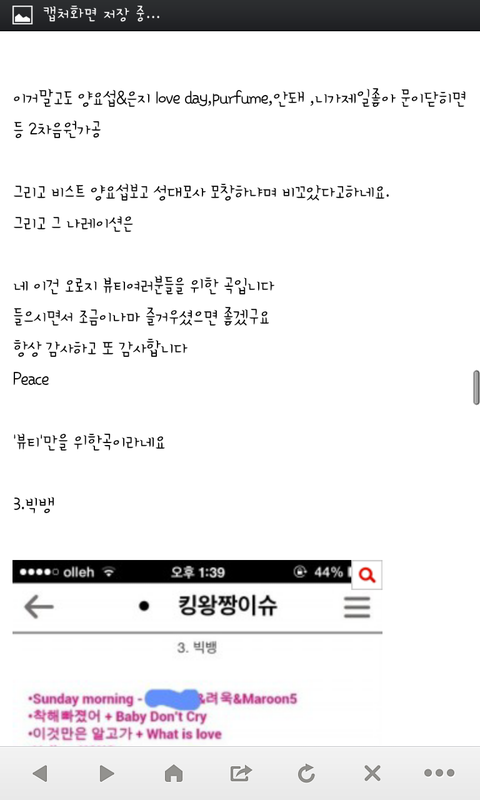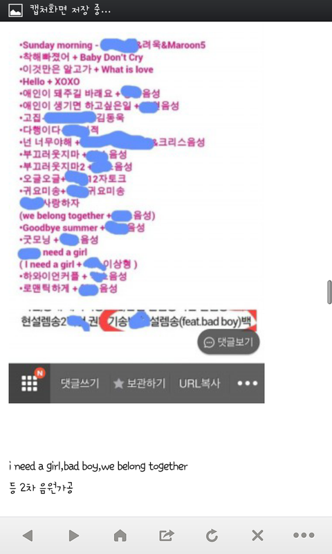 음..어떡해말해야될진모르겠네요 여러분 아래 사진들잘보이죠? 이사진들보고 좀 반성했으면좋겠어요 다른가수분들과 팬분들이 나누는 소중한 노래를 우리가 허락없이 가공하면안되잖아요 예전에 클린운동했다면서 한거많긴해요...?우리진짜 이러지말아요ㅠㅠㅠㅠ읽으면서기분상해하지말아요 우리가잘못한거잖아요...사과도하고 우리 검색어도 바꿔줘야죠 그리고 지금 핸드폰이나 컴퓨터 usb에있는 이차가공한노래들 삭제해줘요...내글 보고 느끼는게 하나라도 있었으면좋겠네요 저희가 그분들의곡들을 사용해서 죄송합니다 첨부파일하나더올려야되는데 열두개가최대라 못올리네요