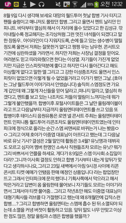 우리 8월 9일날 스엠 울림 합병기사 났었잖아